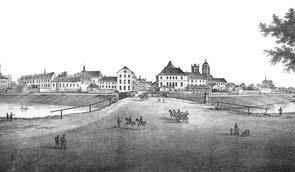Ansicht der Stadt Neuss von Osten, links außen der Kehlturm vor der Bebauung an der Brückstraße; Lithographie, um 1850 -