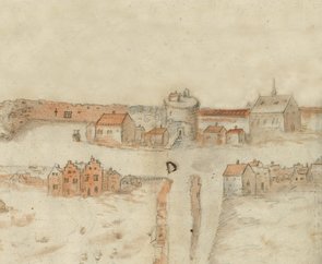 Blick auf die Brückstraße mit dem dahinter liegenden Kehlturm; Zeichnung, 17. Jahrhundert -
