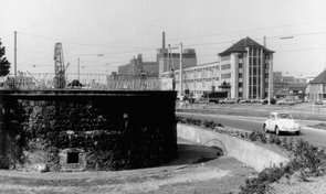 Der freigelegte Kehlturm mit dem Zollamt am Hafenbecken 1 (heute: Haus am Pegel) im Hintergrund, um 1965 -
