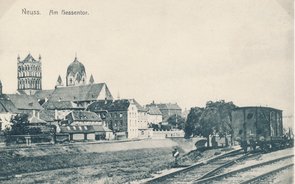 Blick auf die Stadt Neuss mit Quirinusmünster, Zeughaus und Hessentorbrücke (vom Erftkanal aus), links oberhalb des Erftkanals der Kehlturm; Postkarte, um 1920