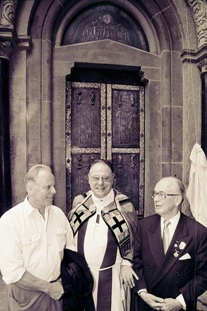 Designed by sculptor Elmar Hillebrand (1925–2016), the Schützenportal (English “Marksmen’s Portal”) has adorned the southern entrance to the Minster since 1995. It is through here that marksmen now enter the church every year for the festive high mass on the shooting festival Sunday. The idea of creating a visible sign of the connection between urban tradition and Christian sentiment with the Schützenportal goes back to the parish priest Msgr. Dr. Hans Dieter Schelauske (1936–2012). The portal was financed by donations from Hermann Wilhelm Thywissen (1917–2008), former president of the shooting club and honorary citizen of the City of Neuss, the St. Quirinus’ Schötzejeselle and other Neuss citizens and institutions.