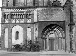 Together with a porch that was later demolished, the south portal of the Minster Church of St. Quirinus formed an important part of the late Romanesque church. Elaborate decorative elements – such as the rich floral interlacing and an eagle capital modelled on Upper Italy – show the influence of Staufer art in the Rhineland. The townspeople and pilgrims from abroad used to enter the church through the south portal. The abbess of the neighbouring aristocratic convent and the high clergy entered through the west portal. The nuns entered the church from the north side, where the convent was located until 1802.