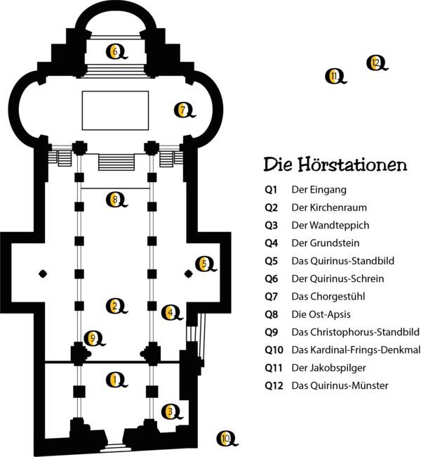Auf dieser Entdeckungsreise erfährst du viele Geheimnisse über die Kirche und über mich, den Heiligen Quirinus. Zusammen mit den Kindern der Görresschule und dem Oberpfarrer führe ich dich durch einen ganz besonderen Ort voller Geschichten. – Viel Spaß!