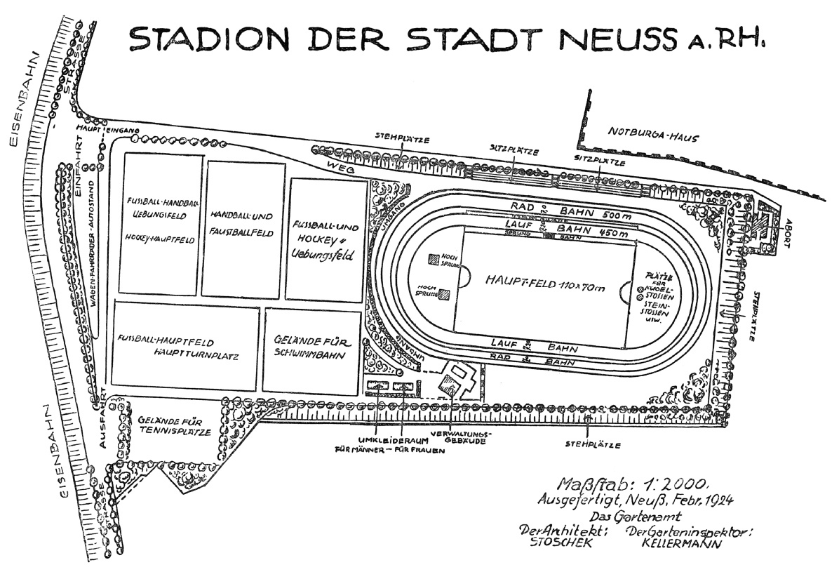 Das Stadion verfügte über moderne Umkleide- und Waschräume sowie ein Verwaltungsgebäude mit Saal und Räumen für die Presse. Von hier aus bot sich ein Ausblick über das durch den Neusser Gartenbaumeister Franz Kellermann entworfene parkähnlich gestaltete Gelände. Der Name „Jahnstadion“ – nach dem sog. „Turnvater“ Friedrich Ludwig Jahn (1778–1852) – bürgerte sich für die gesamte Anlage erst nach der 1926 erfolgten Benennung der benachbarten Straße in „Jahnstraße“ ein.