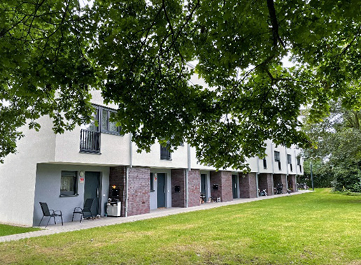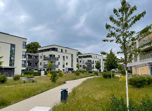 In 3 neu errichteten Geschosswohnungsbauten sowie einem umgebauten Bestandsgebäude entstanden rund 60 freifinanzierte Mietwohnungen. 17 Wohnungen werden zu einem reduzierten (preisgedämpften) Mietpreis vermietet.