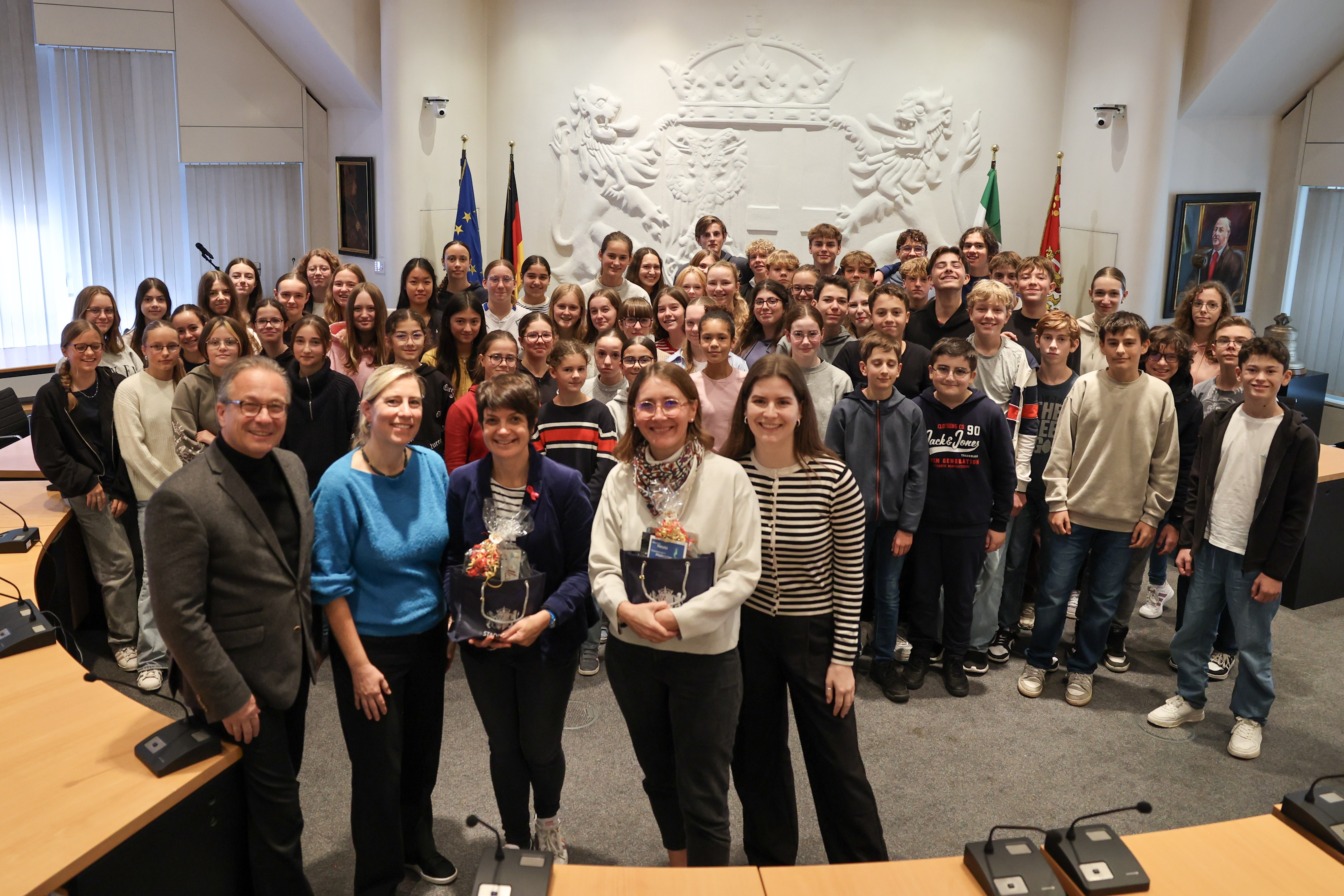 Am Donnerstag, 10. Oktober 2024, empfing Bürgermeister Reiner Breuer Schüler*innen des Collège Perrot d’Ablancourt aus Châlons-en-Champagne, der französischen Partnerstadt von Neuss. Die Schüler*innen sind im Rahmen eines Austausches mit dem Nelly-Sachs-Gymnasium zu Gast in Neuss. Insgesamt versammelten sich etwa 72 Schüler*innen im Alter von zwölf bis 14, darunter 36 Schüler*innen aus Frankreich und vier Lehrkräfte im Ratssaal, um vom Bürgermeister persönlich begrüßt zu werden. Nach der Begrüßung und der Ansprache des Bürgermeisters stellten sowohl die Neusser als auch die französischen Schüler*innen dem Bürgermeister einige Fragen. Besonders interessiert waren die Jugendlichen an der Arbeit des Bürgermeisters und dem Neusser Bürger-Schützenfest. Zum Ende hielten die französischen Schüler*innen gemeinsam mit ihrer Lehrerin Laurianne Buache noch einen kleinen Vortrag auf Deutsch.