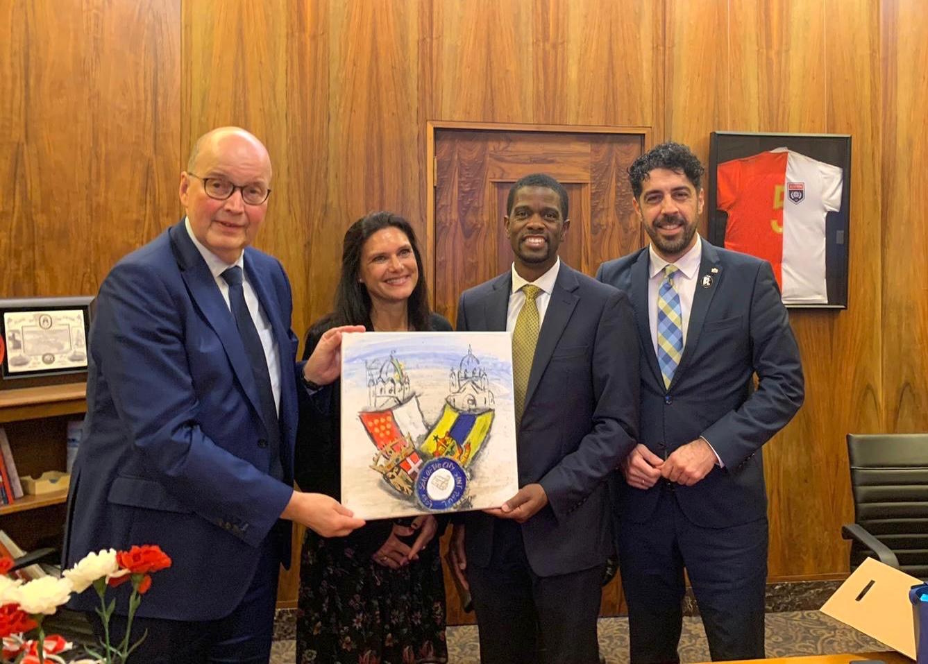 Im Mittelpunkt der Reise stand ein persönliches Gespräch mit Bürgermeister Melvin Carter. Dabei brachten beide Seiten ihre Wertschätzung für die bereits 25 Jahre bestehende Städtepartnerschaft zum Ausdruck und bekräftigten, diese vor allem auf wirtschaftlicher und kultureller Ebene zu intensivieren. Frank Gensler überreichte Melvin Carter stellvertretend für Bürgermeister Reiner Breuer ein vom Neusser Künstler Helmut Wessels gemaltes Bild. Dieses zeigt unter anderem die Stadtwappen von Neuss und Saint Paul als Zeichen der langjährigen Partnerschaft.