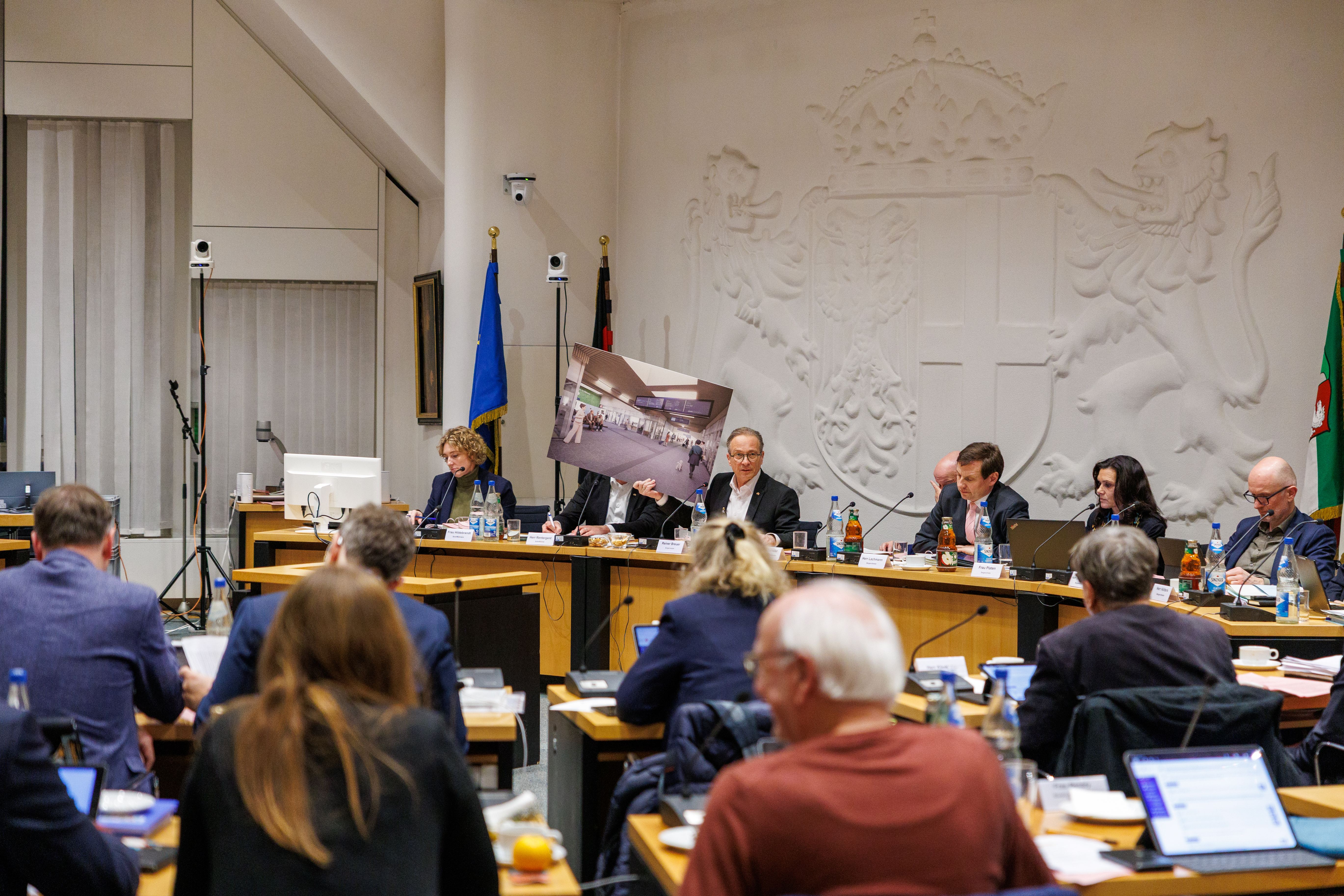 Vorhang auf am Hauptbahnhof in Neuss – dafür haben am Freitag, 12.12.2025, Ina Scharrenbach, Ministerin für Heimat, Kommunales, Bau und Digitalisierung des Landes NRW und Werner Lübberink, Konzernbevollmächtiger der DB für das Land Nordrhein-Westfalen gemeinsam mit Bürgermeister Reiner Breuer gesorgt. Anlässlich der beginnenden Umbaumaßnahmen wurden die Visualisierungen für eine anstehende, umfassende Modernisierung des Empfangsgebäudes am Hauptbahnhof Neuss enthüllt und erstmals der Öffentlichkeit präsentiert. Die zugleich unterzeichnete Realisierungs- und Finanzierungsvereinbarung markiert den offiziellen Auftakt für die bauliche Aufwertung einer der zentralen linksrheinischen Mobilitätsorte – und setzt zugleich ein starkes Zeichen für das landesweite Städtebau- und Investitionsprogramm „Schöner ankommen in NRW“.