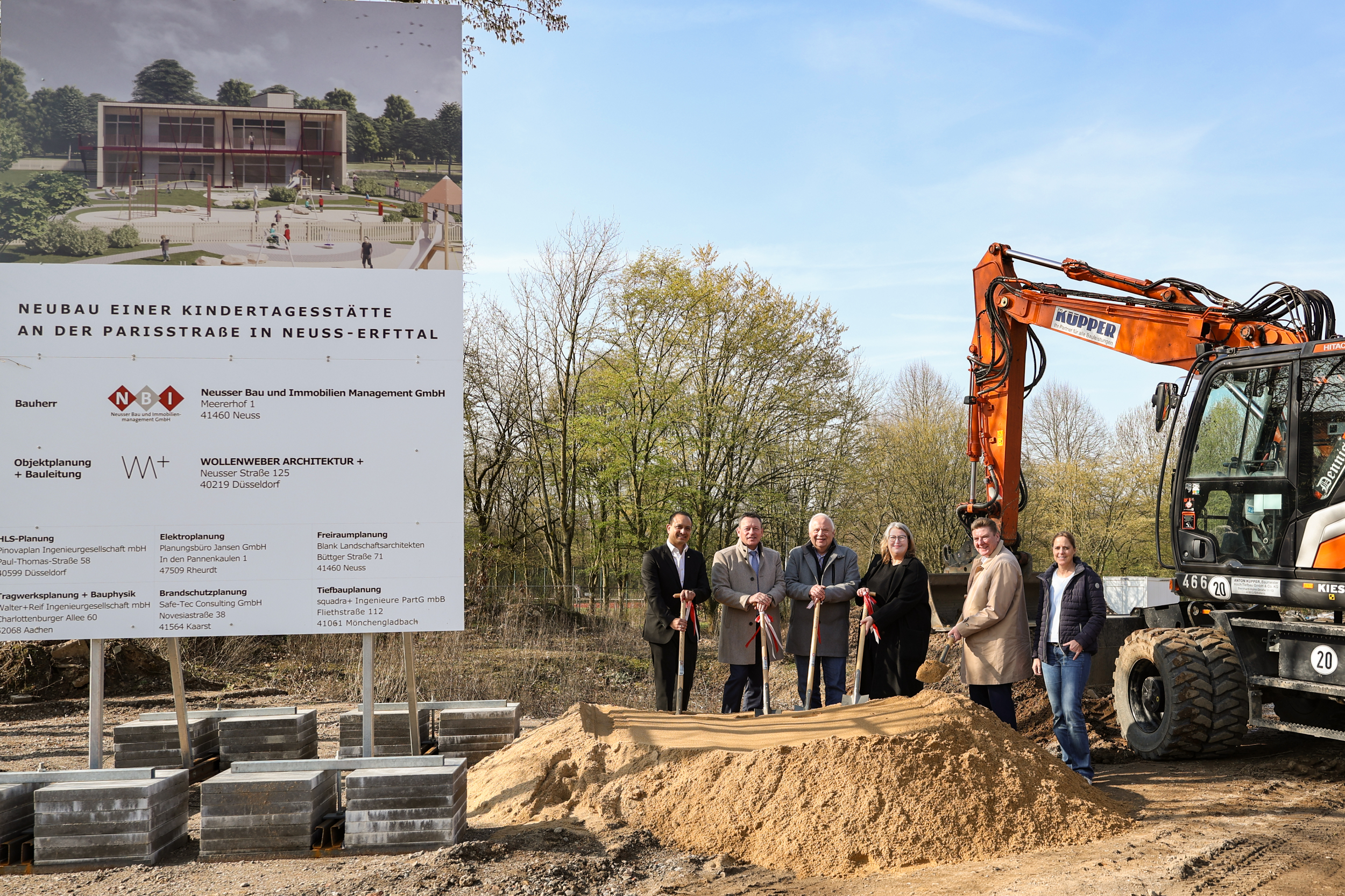 Mit dem symbolischen Spatenstich haben die Bauarbeiten für eine neue Kindertagesstätte an der Parisstraße im Neusser Stadtteil Erfttal begonnen. Bauherr des Projekts ist die Neusser Bau und Immobilienmanagement GmbH (NBI), die damit einen weiteren Beitrag zum Ausbau der Kinderbetreuungsangebote in der Stadt leistet. Die Projektsteuerung hat in bewährterweise die Neusser Bauverein GmbH übernommen. Geplant wurde das Gebäude vom Düsseldorfer Architekturbüro Wollenweber Architektur.